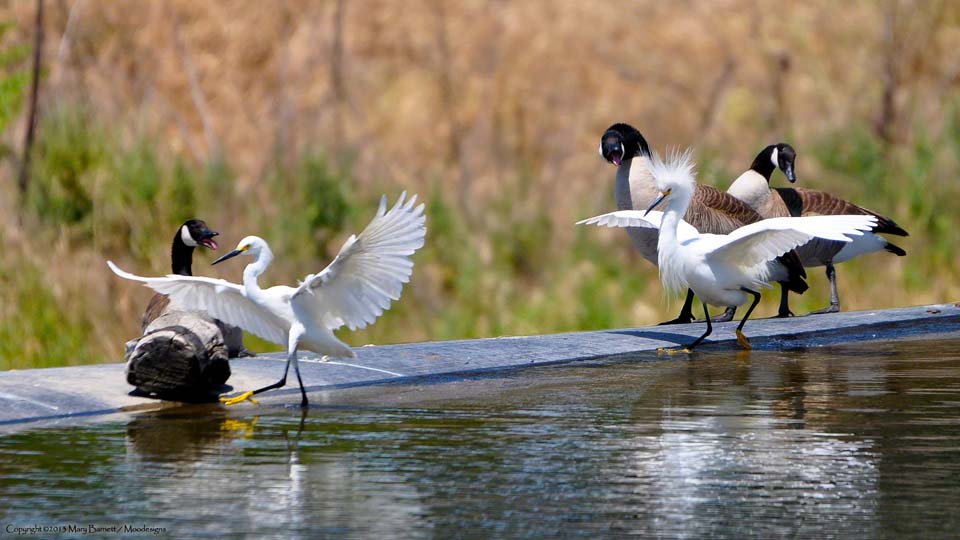Canada Geese, Snowy Egret flying in